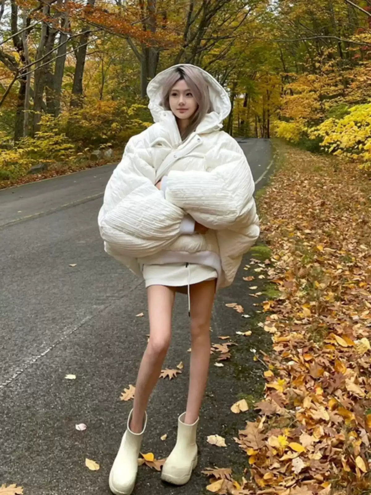 Get ready to make a bold statement with this Oversized Puffer Jacket in ivory white. Designed for the fashion-forward. this jacket features exaggerated sleeves and an ultra-puffy design to keep you warm while turning heads. The large hood and plush material ensure maximum coziness. making it perfect for cold-weather days. Pair it with your favorite mini dress or casual outfit for a chic. layered look.