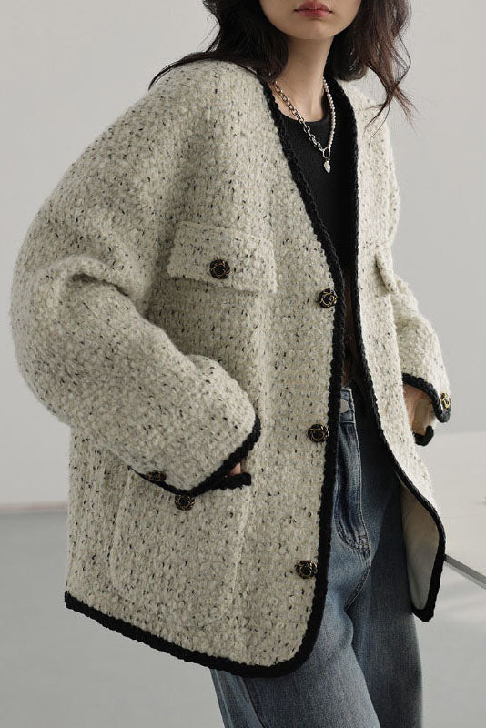 This Black trim long sleeve vintage V-neck tweed top combines classic style with contemporary details. The vintage tweed fabric and black trim bring timeless sophistication. while the V-neck silhouette is modern and flattering. Perfect for an effortless day to night look.
