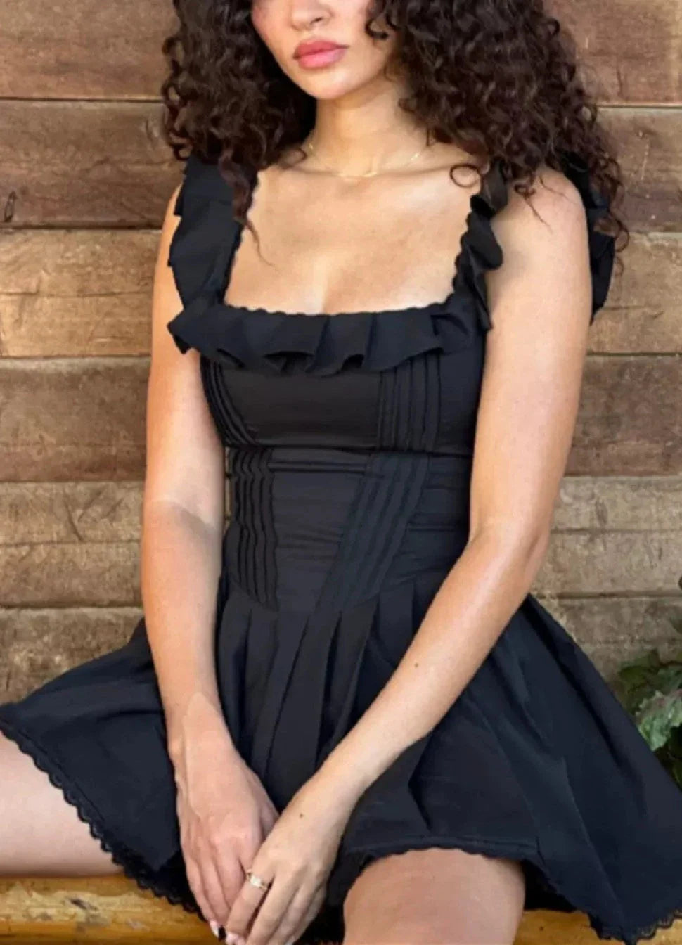 Feel like a modern-day Barbie in our Darleth Ruffle Detail Mini Dress! With wide ruffle straps and a high waist. this A-line skirt dress is both romantic and slimming. Perfect for a French style look from our Cbano Spring-Summer Collection. (Barbie not included!)
