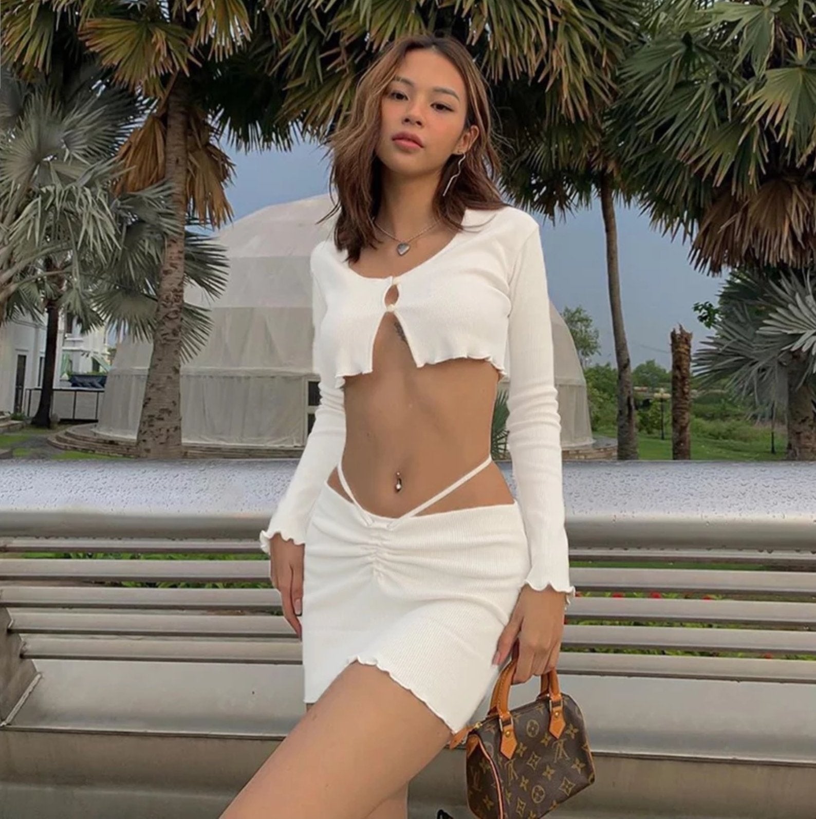 Introducing the Elleny Ribbed Two Piece Set from Cbano's Spring-Summer Collection. This set includes a long sleeve crop top and a strappy mini skirt with a playful cross back design. Available in white. black. and blue to match any mood. (Say goodbye to boring outfits. (You'll be the center of attention in this edgy. backless combo!