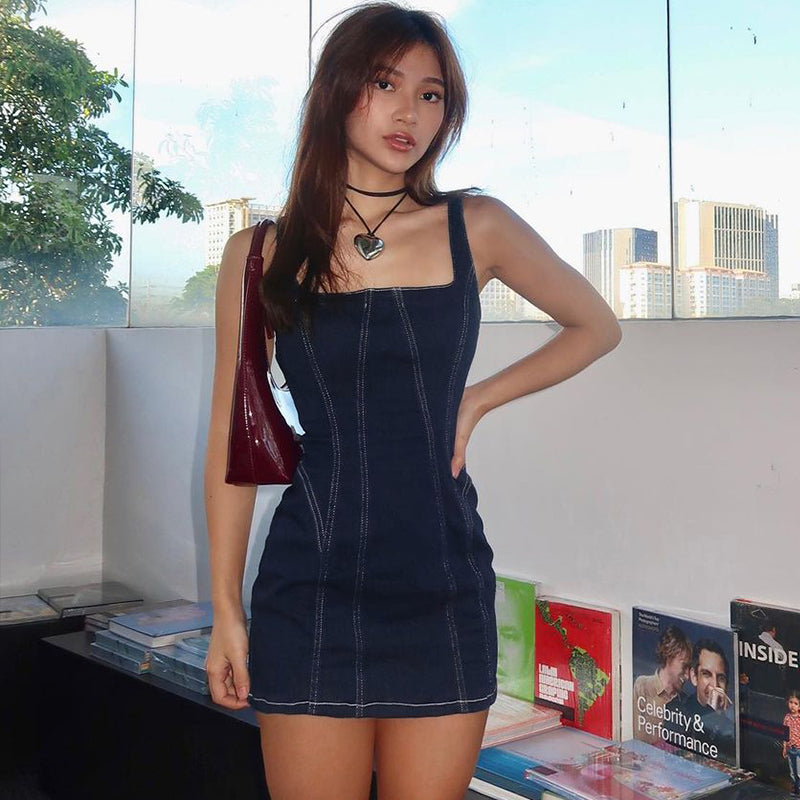 Look hot and retro in the Ellison Denim Mini Dress! This sizzling navy blue number gives you that classic. old-school vibe with its open line design and square neck. Turn up the heat with the bag hip and hot girl style. and strut your stuff in true modern fashionista style!