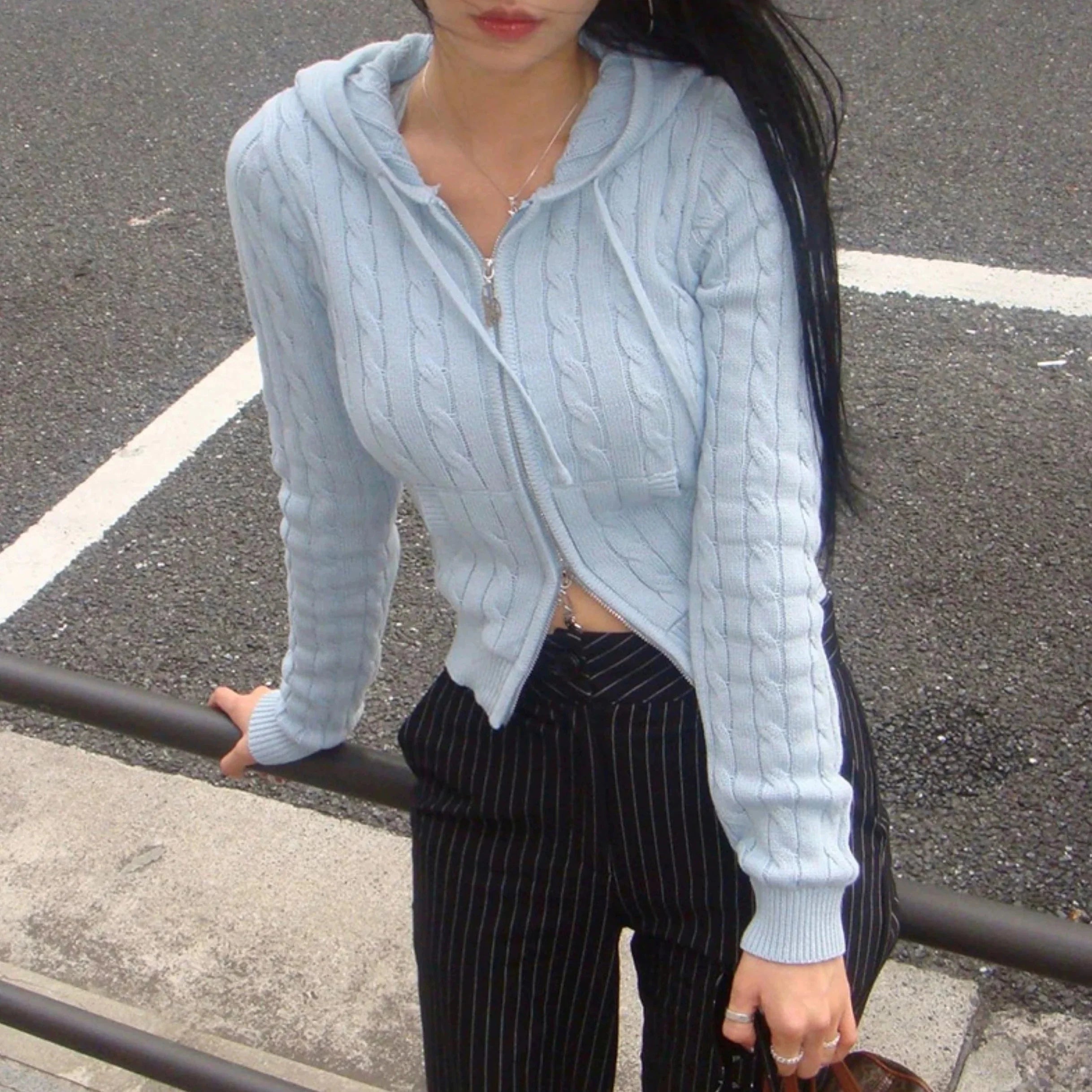 Introducing Cbano's Y2K-approved Francine Sweater Cardigan. knitted to perfection! This casual. slim. and hooded cardigan will keep you cozy in style. with its long sleeves and available colors of Blue. White. and Pink. Snuggle up and look fabulous!