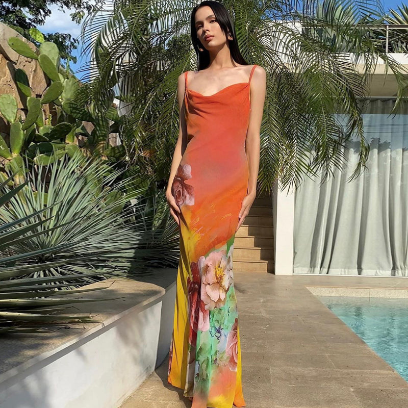 Get ready for the warm weather with the Ibtisam Backless Floral Maxi Dress! This stunning orange dress features a sleeveless design. strappy back. and a cowl neck for a tropical. beachy vibe. Part of the Cbano Spring-Summer Collection. this dress is perfect for a day out or a night out. Spring into style with this must-have piece!