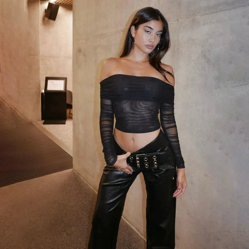 Look red-hot in the Kaira Long Sleeve Mesh Top - it checks all the marks for a gorgeous party look. With its sexy off-shoulder style. slim fit silhouette and sheer mesh construction. you'll be sure to turn heads wherever you go! Dance the night away without a worry - this top's got your back.