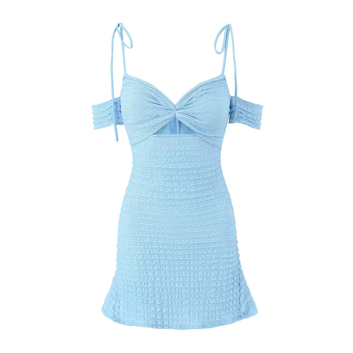 Turn up the heat with the Kyri Shirred Mini Dress. Showcase your style and sexy figure in this slim-fitting dress with off-shoulder neckline and intricate hollow-out pattern that'll have you feelin' like the belle of the ball. Spice up your wardrobe with this hot number. available in shades of white. blue and black. Go and show off your Pure Desire!