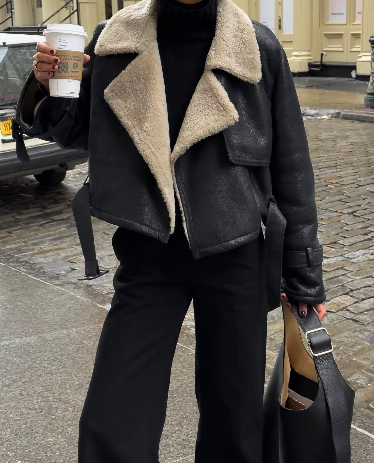 • Contrasting beige shearling collar for added warmth