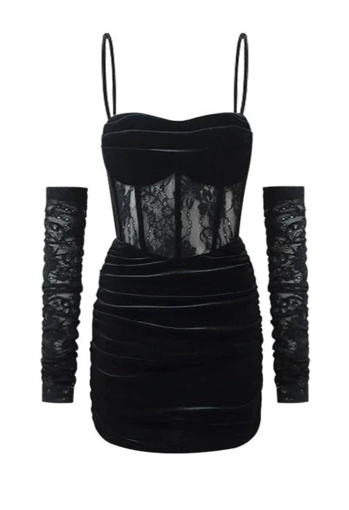 Introducing the Lidia Corset Mini Dress. part of the Cbano Evening Dresses Collection. This sexy and elegant dress features lace sleeves. a plush velvet fabric. and a playful cowl neck. The wrapped skirt creates a slim fit. while the slightly see-through waist adds a touch of seduction. Let your inner vixen shine with this must-have dress.