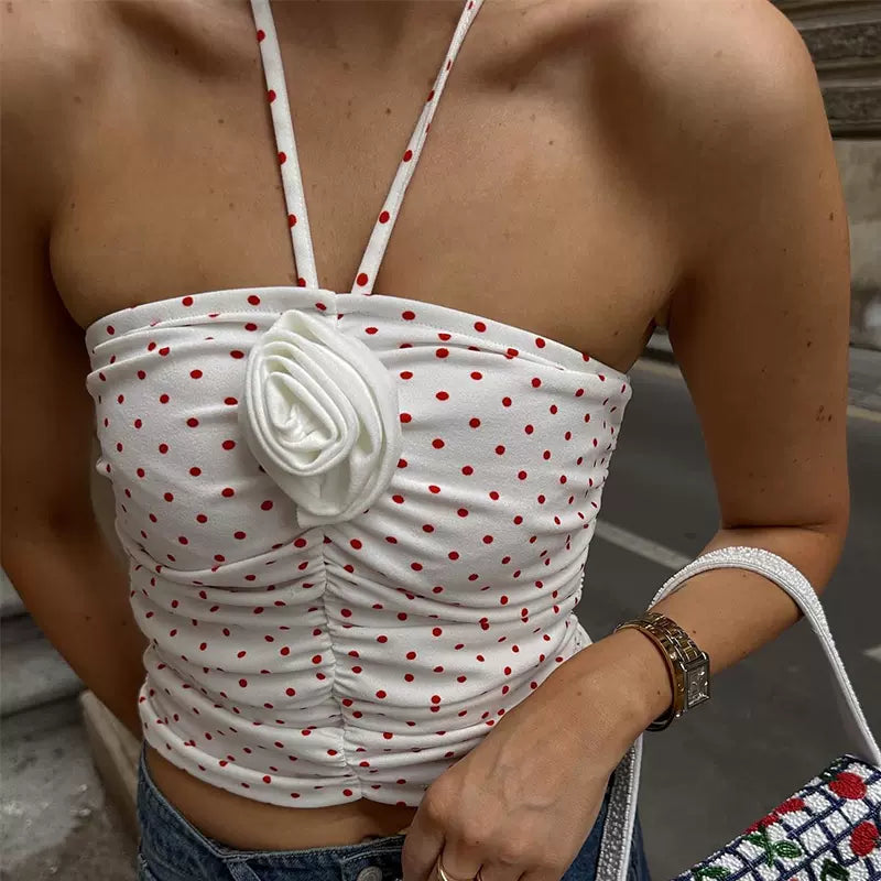 Get ready to turn heads with our Logyn Polka Dot Halter Top! This white crop top features a slim fit and a strappy halterneck for a modern and flattering look. The 3D floral details add a touch of whimsy. perfect for channeling retro French style. From our Cbano Shirts & Tops Collection.