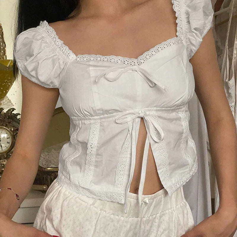 Get ready to add some French flair to your wardrobe with the Nethra Short Sleeve Crop Top! Its off-shoulder puff sleeves and romantic bow tie will make you look cute and versatile. Part of Cbano Modern Romance Collection. this top is perfect for any occasion and will give you a touch of modern elegance.