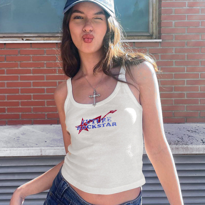 Be the ultimate "hot girl" with our Rocstar Letter Print Tank Top! This sleeveless. white crop top features an American Retro letter print. adding a touch of vintage to your wardrobe. Perfect for a casual. sexy look. this camisole is a must-have from Cbano's Spring-Summer Collection.
