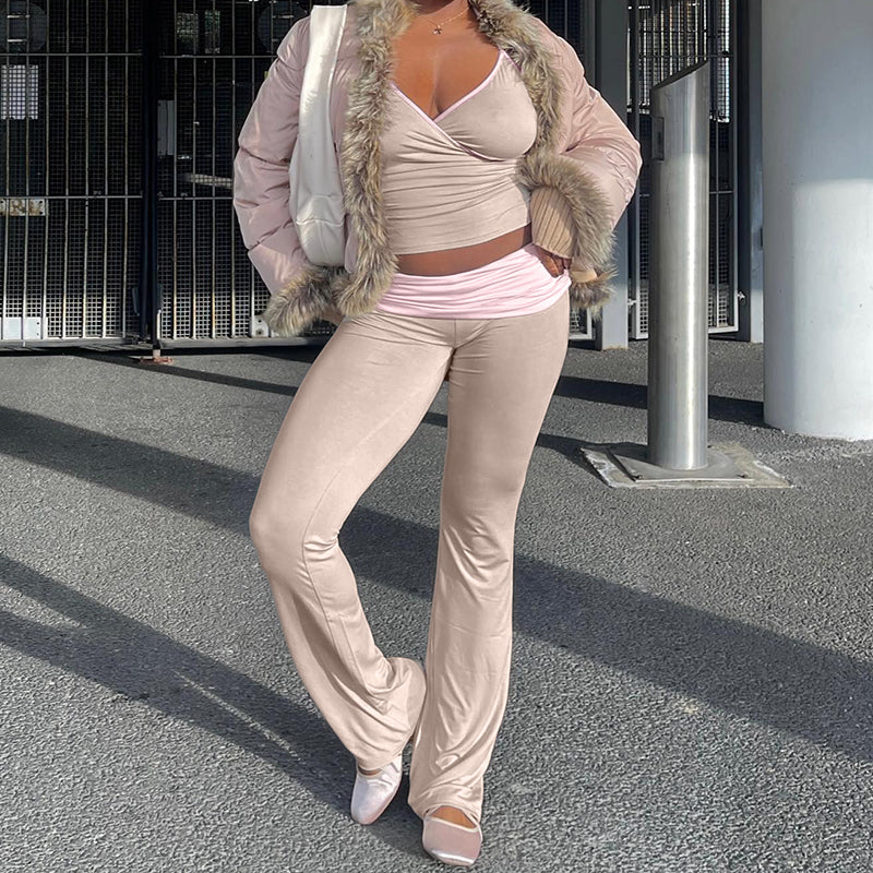 Elevate your wardrobe with the Rowena Pants Set. This sleeveless tank top and slim pants set features a wide high waist for a sleek look. The halterneck and backless design add a touch of playfulness to this casual outfit. available in black and beige from Cbano's Spring-Summer Collection.