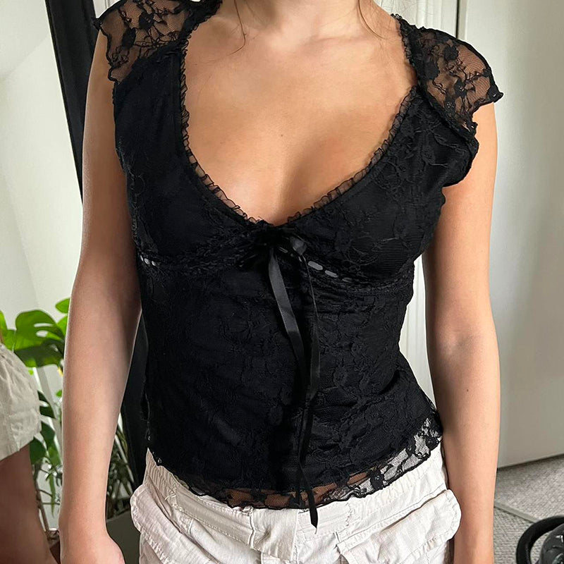 Rock your casual style with the Ruwayda Lace T-Shirt. This black top features a slim fit. short sleeves. and a playful v-neck with bow detailing. The sexy lace details add a touch of edge to this casual piece from the Cbano Spring-Summer Collection.
