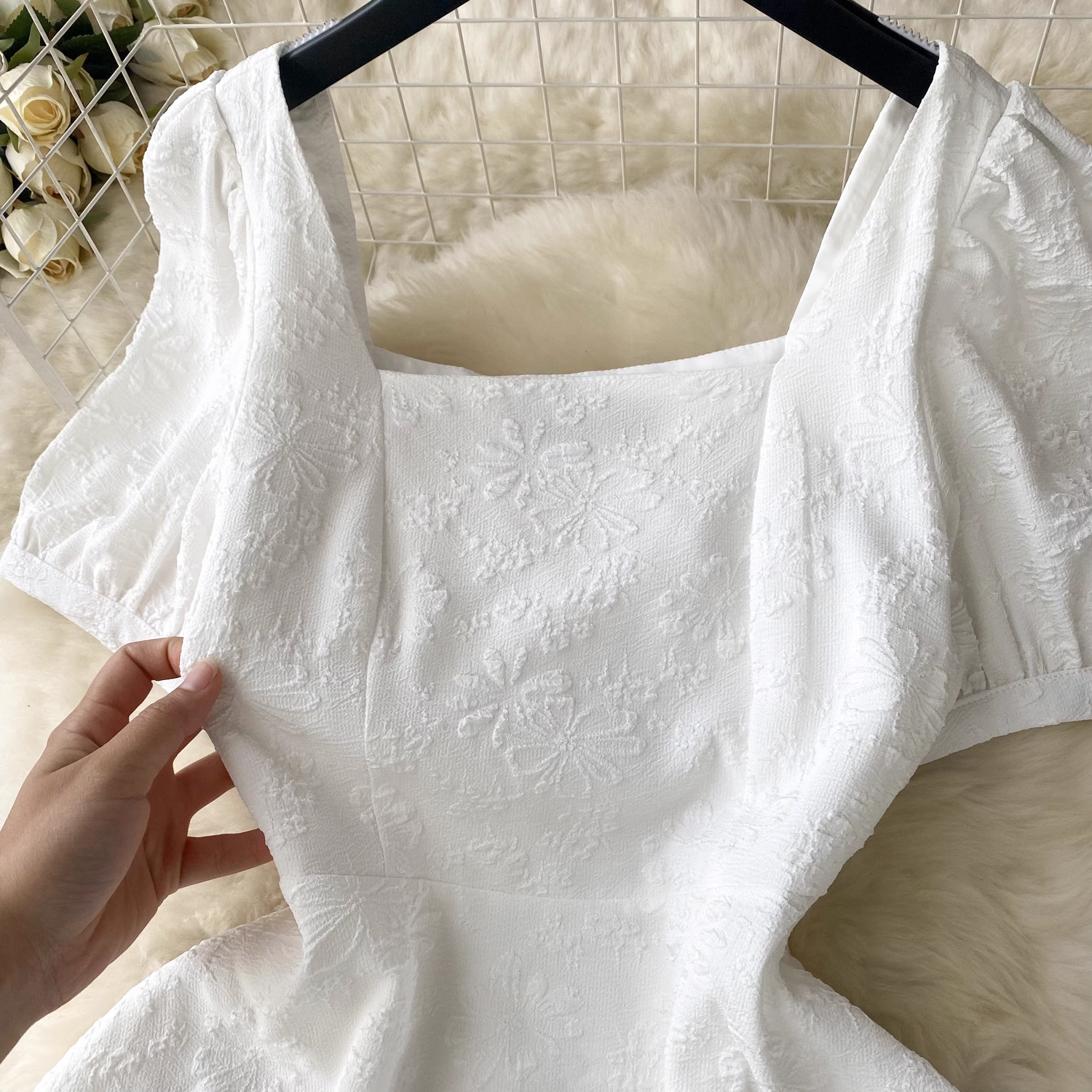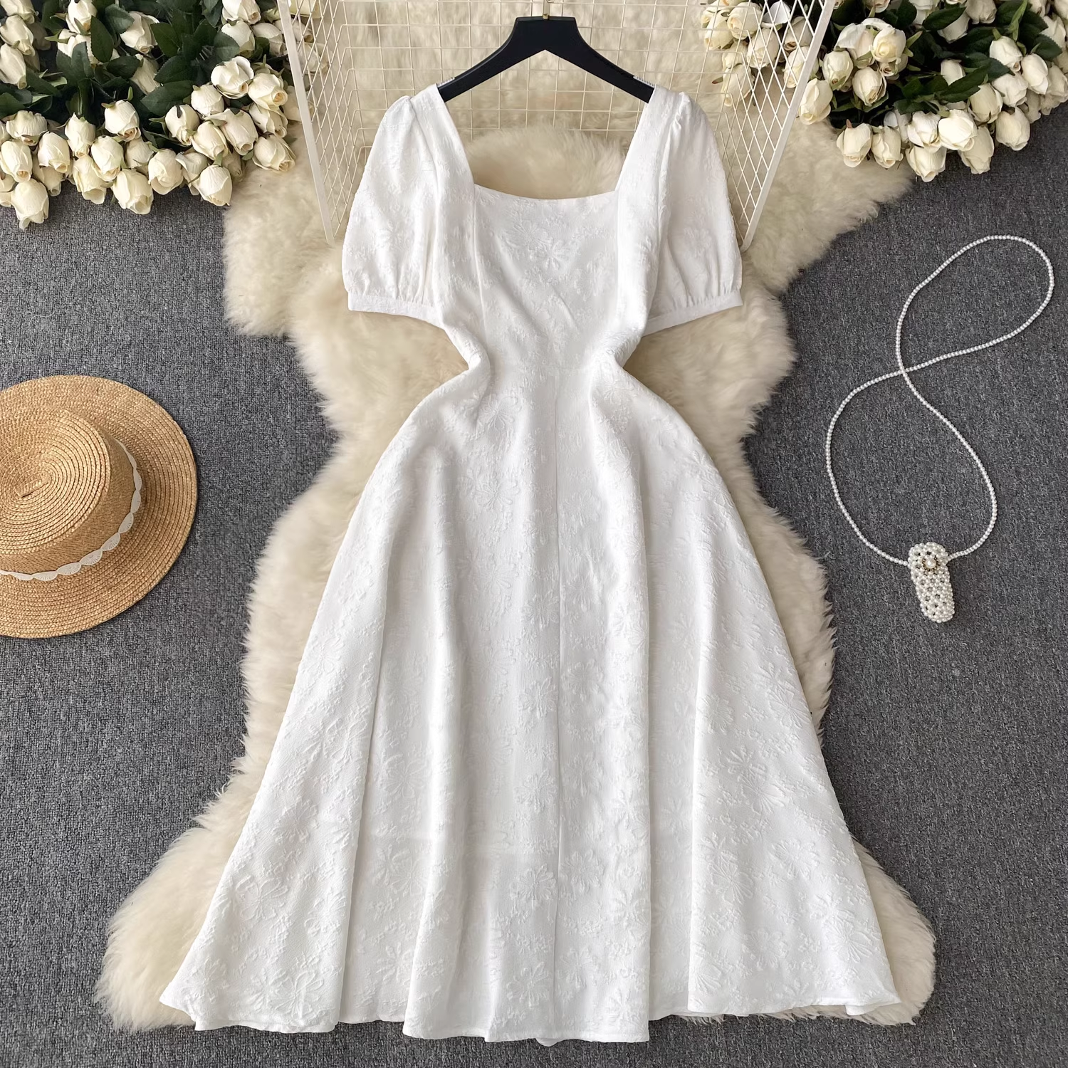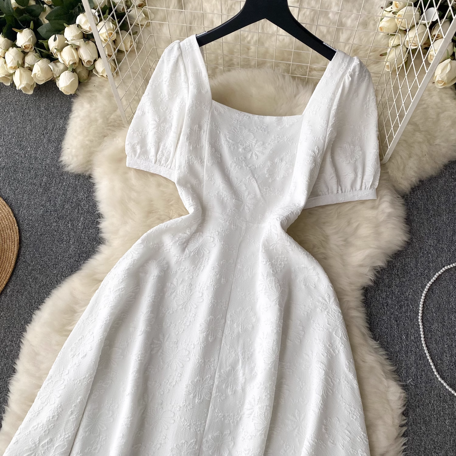 women's summer square collar puff sleeve dress,