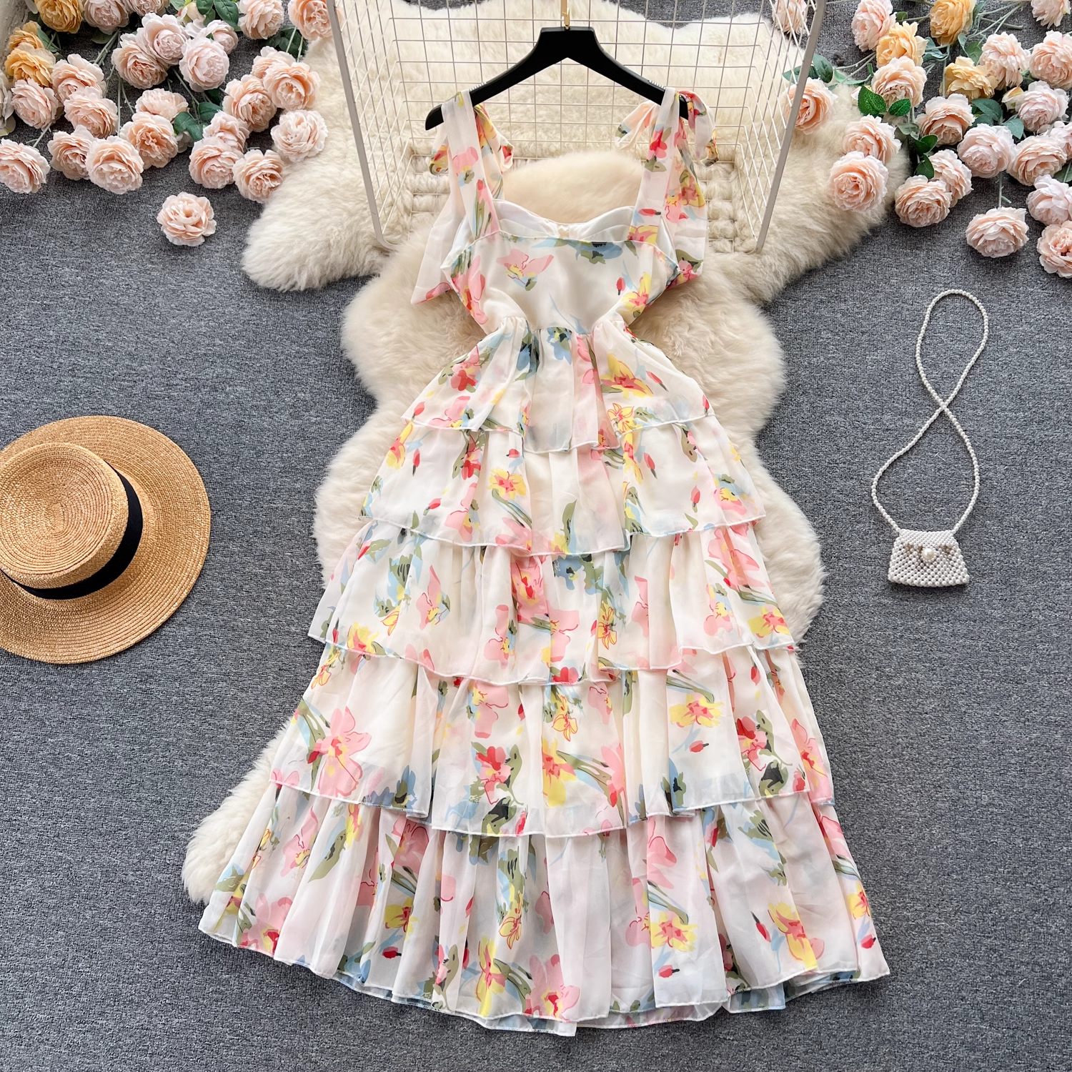 Women's suspender floral dress summer chiffon dress