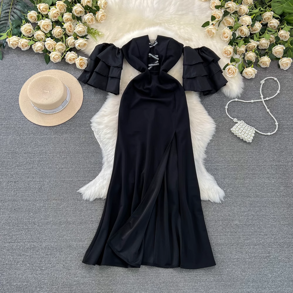 Women's trumpet short-sleeved mid-length slit A-line dress